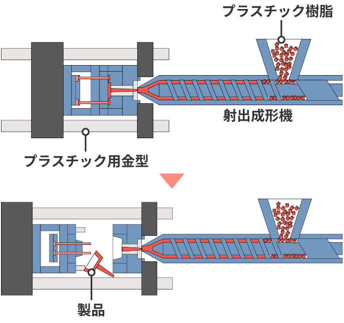 プラスチック金型は、プラスチック製品の製造に用いられます。射出成形機に実装された金型に、加熱溶融したプラスチック樹脂を注入し、冷却、固化することでプラスチックを成形します。