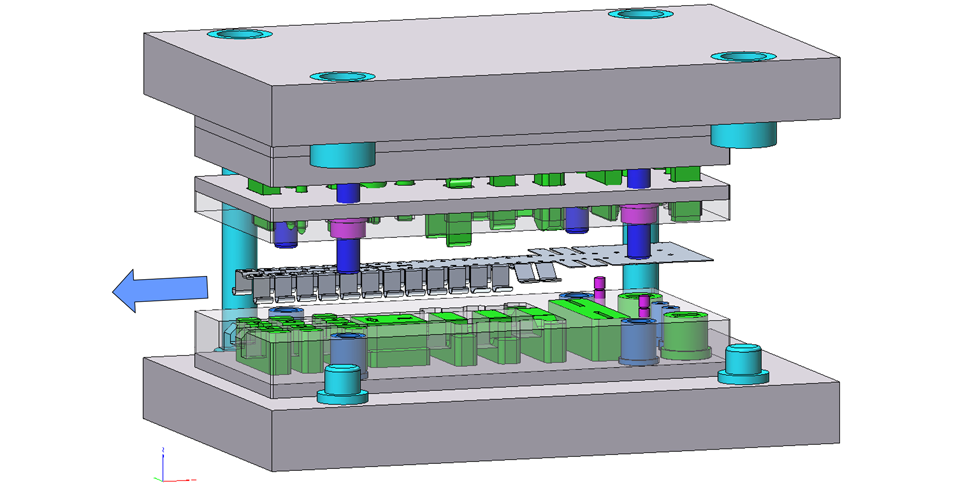 1つの金型内で複数工程を連続的に行う金型。材料は送り装置によって一定ピッチで移動し、加工の工程を順番に通過します。大量生産に適し、加工精度と生産性の両立が期待できます。