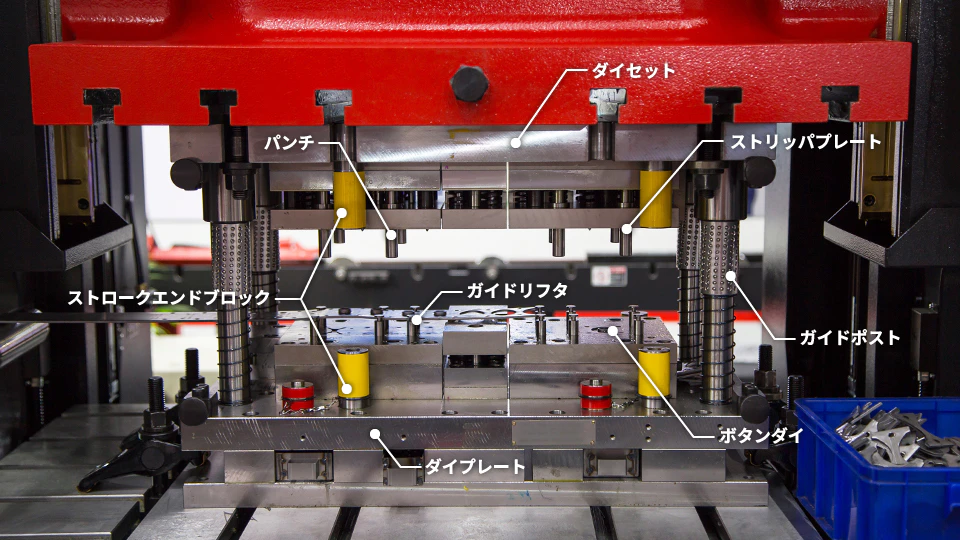 | ボタンダイ | 下型の受け側となり、パンチと対になる形状で、抜き型・成形型の役割を担います。 |