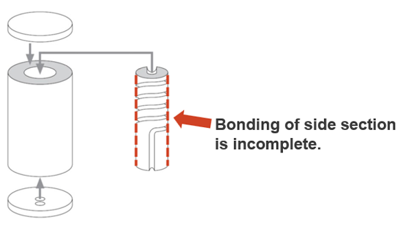 In a joint where a cooling channel is inserted into a cylinder, only the flat surface of the lid will be properly bonded; incomplete bonding will result on the sidewalls.
