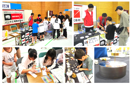 当社で加工した金属のコマを使った「コマ回しチャレンジ」のブースを設け、子どもたちから大変好評でした。